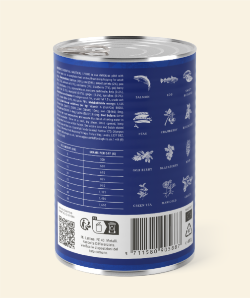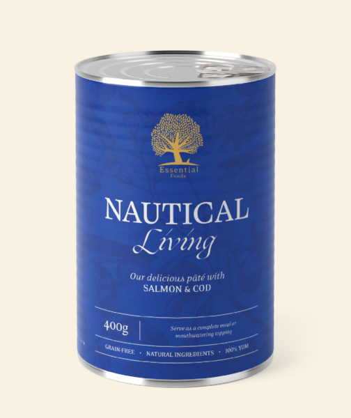 ESSENTIAL NAUTICAL LIVING is our delicious pâté with salmon and cod. A complete meal or mouthwatering topping for adult dogs.